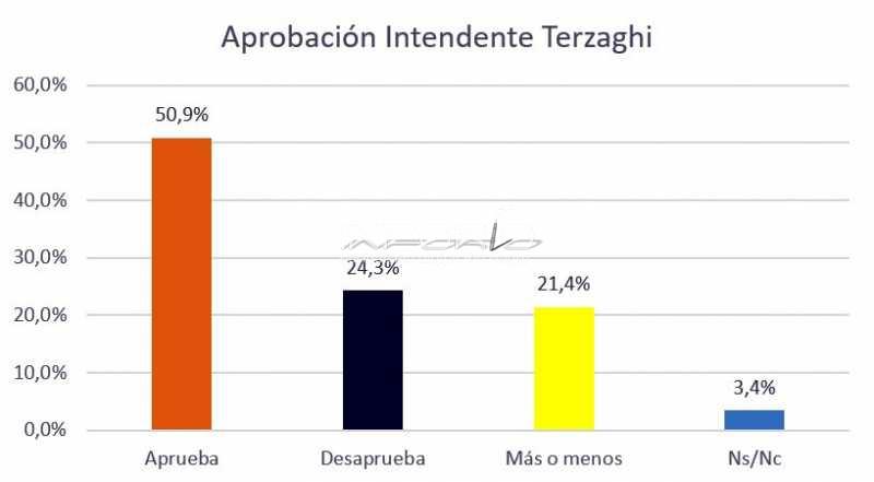 Consigue números importante de aprobación el Intendente del departamento, Oscar Terzaghi , que con un 51% de juicios de esa naturaleza tiene una posición favorable entre los ciudadanos de su departamento. Los que desaprueban la gestión son el 24,3% de los entrevistados y los que manifiestan que “no aprueban ni desaprueban” (más o menos en el gráfico) son el 21.4% de los habitantes del departamento. El Intendente de Río Negro obtiene altos niveles de aprobación en la capital del departamento (superando el 60%) y registro menores pero elevados tanto en Young como en San Javier.