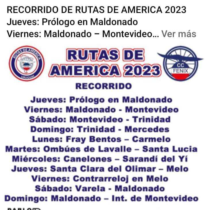 La tradicional competencia ciclista, Rutas de América se realizará del 16 al 26 de febrero y será la 51° edición, organizada por el C. C, Fénix. Hay un total de 175 ciclistas participantes (nacionales e internacionales) y tendrá más de 1.500 kilómetros de recorrido. La carrera lanzará el 16 de febrero en Maldonado, en la Pista de Ciclismo del Jagüel, y tendrá 10 etapas que culminarán en Montevideo. El próximo lunes 20 de Febrero Rutas de América tendrá su punto de largada en Fray Bentos.-