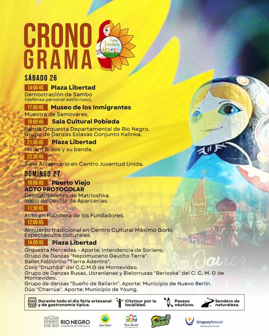 Entre los momentos destacados figuran el acto protocolar con el descubrimiento de una Matrioshka conmemorativa, el tradicional desfile de aparcerías, el almuerzo comunitario y las presentaciones artísticas de la Orquesta Departamental, el Conjunto Kalinka, Miriam Britos y otros grupos locales y regionales.