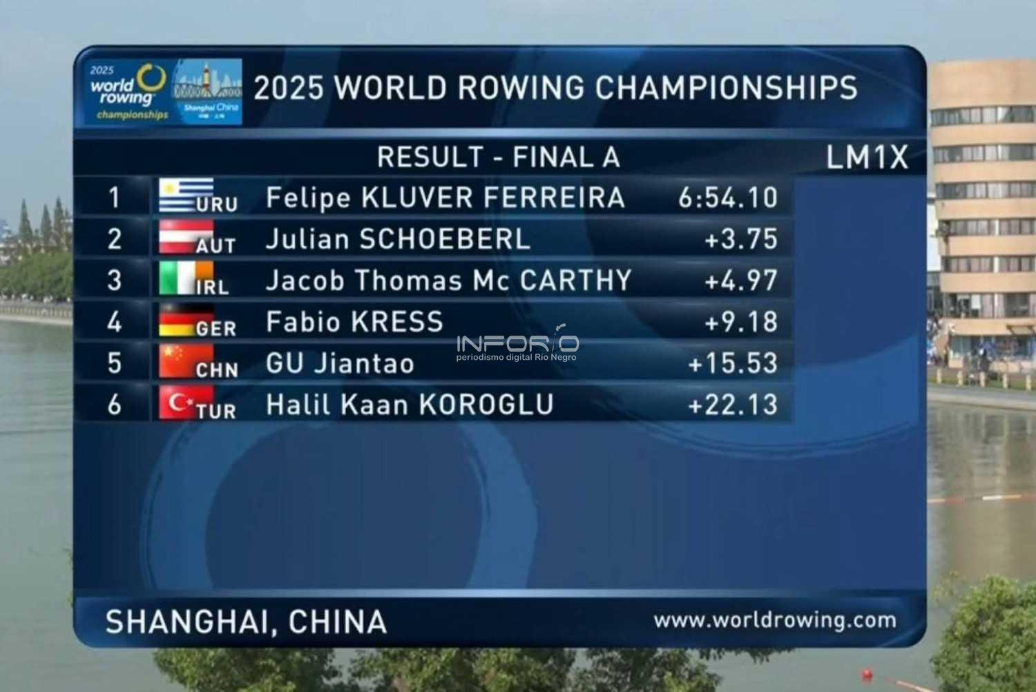 Felipe Kluver, Mercedario radicado en la Colonia Tomás Berreta del departamento de Río Negro, se consagró campeón del mundo en la final A del Mundial de Remo disputado en Shanghái, China.