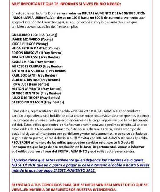 Sin embargo en las últimas horas la difusión a través de WhatsApp y Facebook de un volante ha causado malestar en el Frente Amplio. Por distintas vías se ha visto publicado en redes sociales el volante que entre otras cosas hace referencia a la votación de "un brutal aumento de la contribución inmobiliaria urbana... Aumento que apoya el intendente Terzaghi, su equipo económico y lo que más duele es que también lo apoyan los ediles del Frente Amplio".