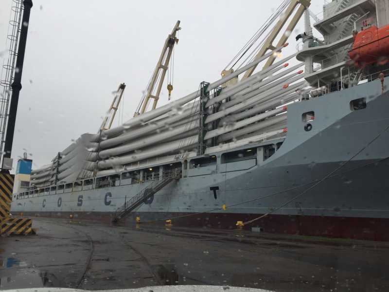 Tras la llegada del primer buque a principios de junio, llegó este segundo buque que principalmente trae aspas desde China. De la operativa están trabajando, personas que integran la bolsa de trabajo. La misma está a cargo de Schandy y Rioestiba.