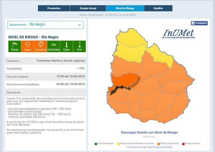 Gran parte del país está bajo alerta naranja por tormentas fuertes y lluvias copiosas. Dentro de los departamentos con alerta naranja se encuentra Río Negro según el boletín de INUMET.