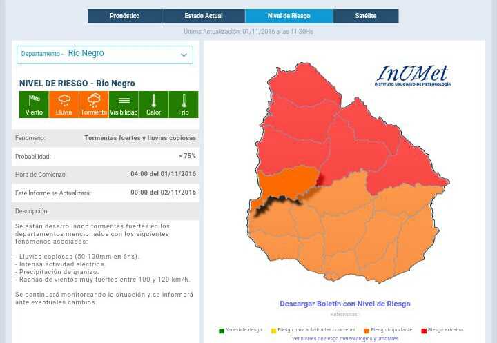 Para los departamentos de Artigas, Rivera, Salto, Tacuarembó, Cerro Largo y Paysandú se emitió un alerta rojo por tormentas severas. Río Negro continúa bajo alerta naranja. La situación se sigue monitoreando y en caso de cambiar se actualizará.