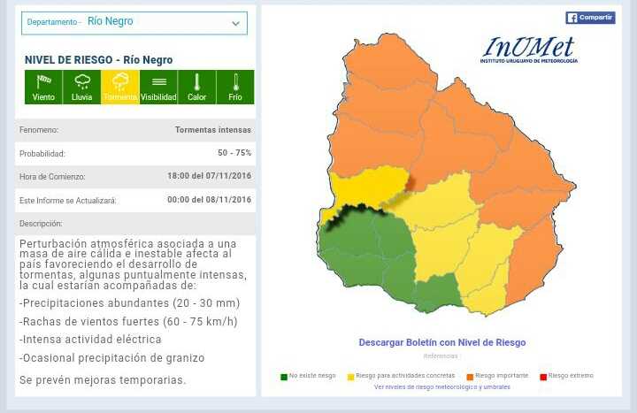 Sin embargo Río Negro bajó el nivel de riesgo a amarillo por tormentas intensas y Soriano no tiene advertencia.