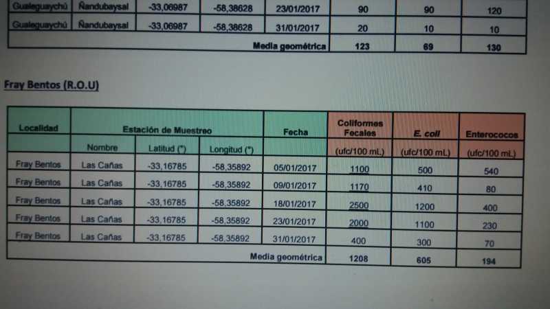 En cuanto a Escherichia coli: La media geométrica de al menos cinco muestras en treinta días no debe exceder los 126 UFC/100 ml. En el caso de Fray Bentos, el informe arroja un valor de 605 UFC/100mL