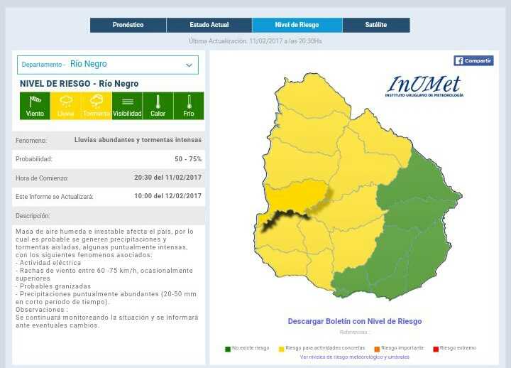 El INUMET emitió una advertencia amarilla por lluvias y tormentas para 12 departamentos dentro de los cuales se encuentran Río Negro y Soriano.