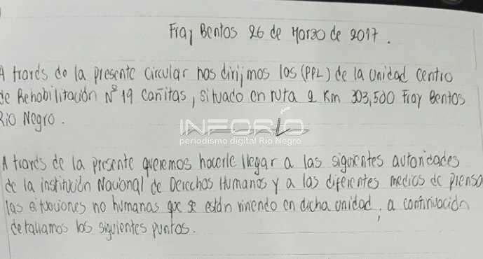 En la carta acercada a InfoRIO fechada 26 de marzo los reclusos exponen una serie de puntualizaciones donde denuncian que se dan “Situaciones no humanas que se están viviendo en la unidad”. Entre el detalle se establece que hay una mala aplicación de los procedimientos, existiendo diferentes criterios y falta de voluntad para revertir las situaciones. Además se manifestó que "la unidad está superpoblada".