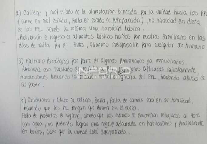 Remarcaron que hay requisas violando la privacidad, reafirman el derecho al corte de recreación, y que se les aplica la prohibición de comunicación telefónica, e incluso no se le ha comunicado defunción de familiares. “Somos personas privadas de libertad, entendemos que estamos limitados a hacer uso de nuestra libertad, pero no de que violen nuestros derechos humanos., dado que esta unidad es un centro de rehabilitación con una seguridad mínima por lo cual entendemos que no se no está respetando como seres humanos” reza en el párrafo final.