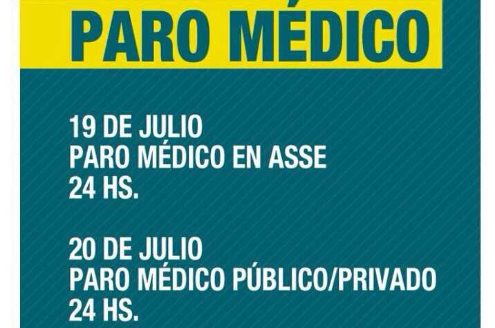 Por las razones expuestas convocamos a un PARO MEDICO DE 24 HORAS EL DÍA 19 DE JULIO EN ASSE Y DE 24 HORAS EL DIA 20 DE JULIO EN LOS SECTORES PÚBLICO Y PRIVADO.