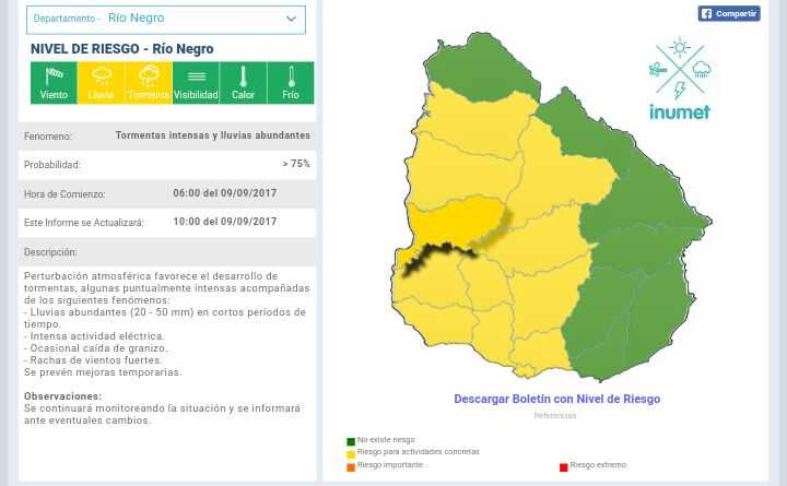 Luego de las 6 de la mañana se actualizó nuevamente el boletín y son 12 los departamentos bajo la advertencia amarilla. Artigas, Salto, Paysandú, Río Negro, Soriano, Colonia, San José, Flores, Florida, Tacuarembó, Durazno, Canelones y Montevideo son lo departamentos afectados.