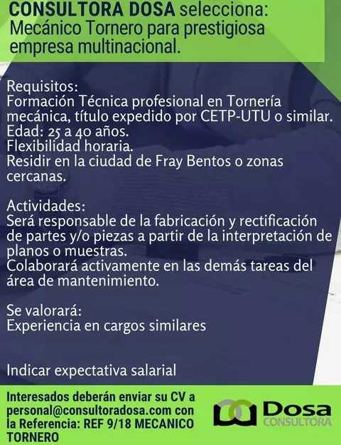 Los interesados deben enviar mail a personal@consultoradosa.com con referencia Ref 9/18 Mecánico Tornero.