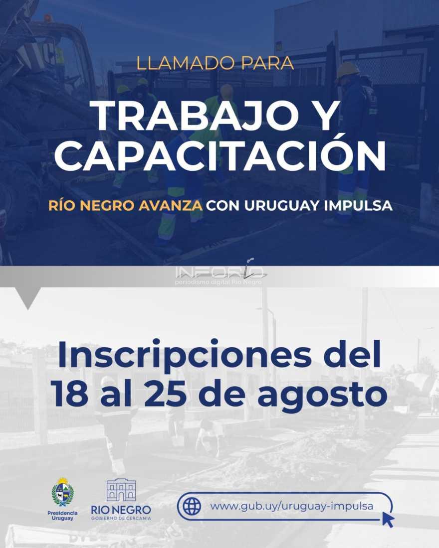 La Intendencia de Río Negro informa que desde este lunes 18 al 25 de agosto estarán abiertas las inscripciones al Programa Uruguay Impulsa (antes conocido como Jornales Solidarios).Esta iniciativa, impulsada a nivel nacional, brindará empleo temporal y capacitación a vecinas y vecinos del departamento, representan...
