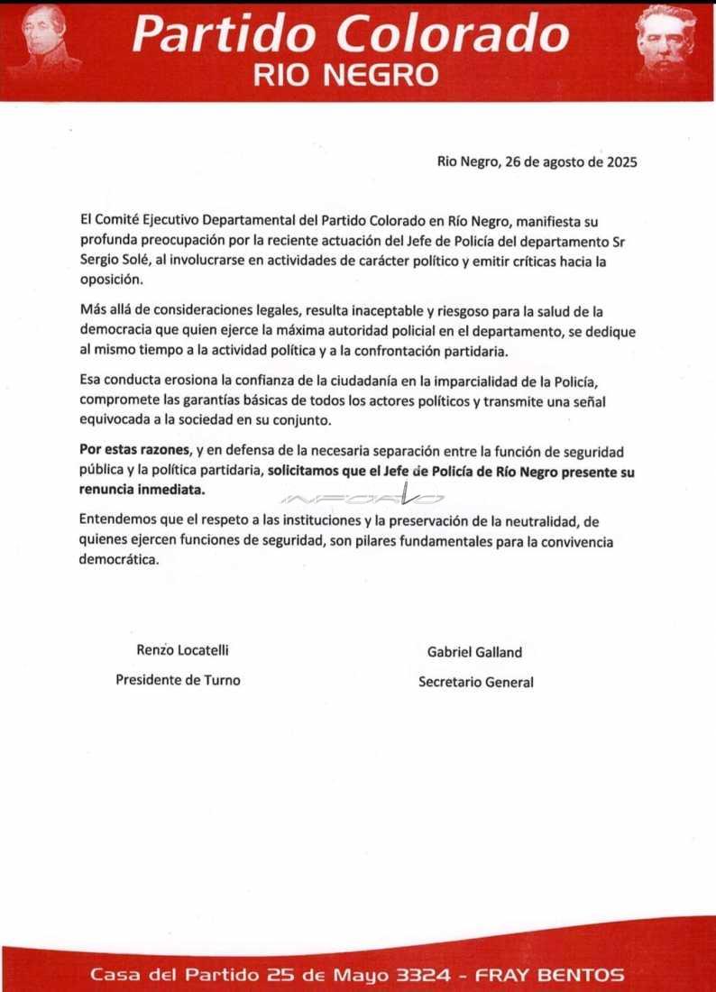 El Partido Colorado emitió un comunicado público donde también solicita la renuncia y/o destitución del actual Jefe de Policía Sergio solé, por su reciente participación en una reunión política partidaria y se suma, sus propias declaraciones pública a una emisora radial.  ...