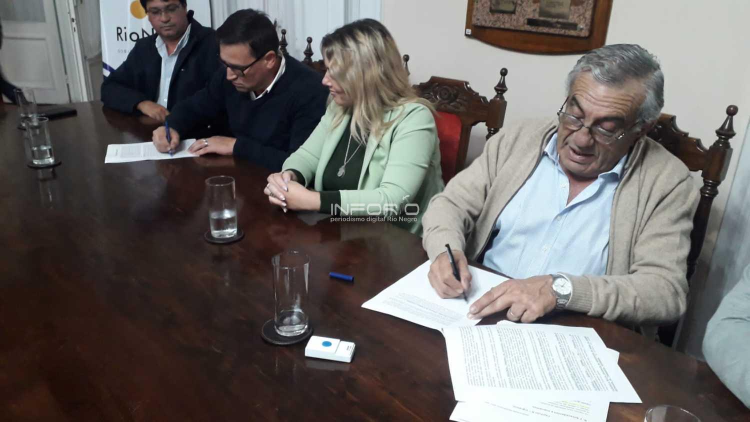 En acto cumplido en presencia del intendente Omar Lafluf, la presidenta de la Federacion Nacional de Funcionarios Municipales, Valeria Ripoll, el presidente de Adeom Río Negro, Richard Martinez y el vicepresidente del gremio, Miguel Ivanovich, se firmo el acuerdo entre Adeom y la Intendencia de Río Negro.