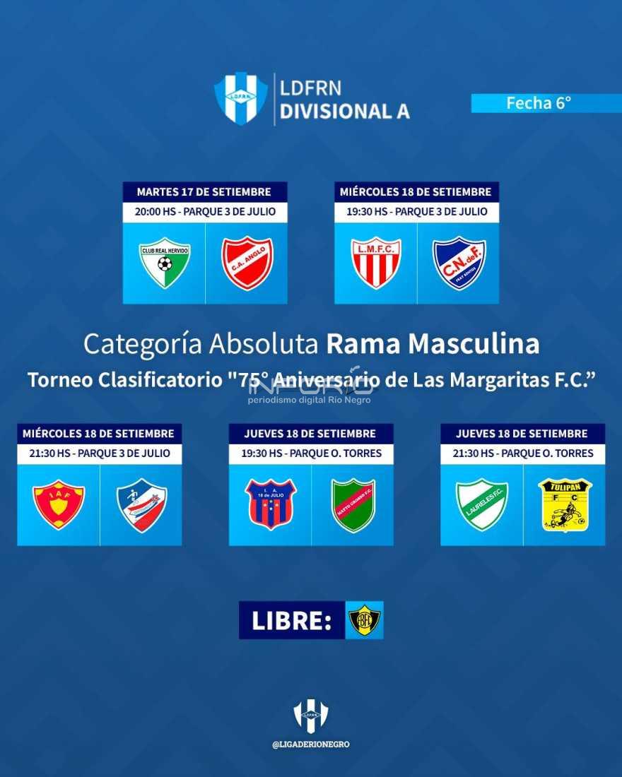 Se juega a partir de hoy martes la 6ta. fecha del Torneo Clasicatorio 75° Aniversario de Las Margaritas FC y éstos son los detalles:Martes en cancha 3 de Julio hora 20:00 Real Hervido vs Anglo, como único partido.El miércoles también en el 3 de Julio: a las 20.00 Las Margaritas enfrenta a Nacional y a las ...