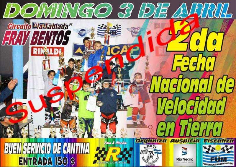 Las autoridades locales de AMOTI, han comunicado no solo por el agua caída, sino por el mal tiempo pronosticado para el fin de semana, la supensión de la 2ª fecha del Campeonato Nacional de Velocidad en Tierra, que se disputaba este dmingo en el circuito fraybentino de "La Tablada".