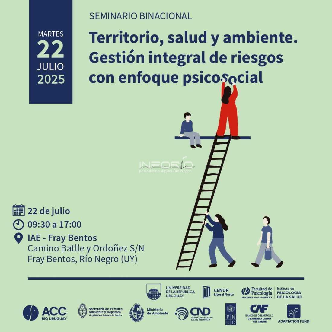 La Casa de la Universidad de la República de Río Negro está invitando a los interesados para un Seminario Binacional denominado: Territorio, salud y ambiente. Gestión integral de riesgos con enfoque psicosocial.La actividad se desarrollará el próximo martes 22 de julio, de 9.30 a 17.00 horas en el IA...
