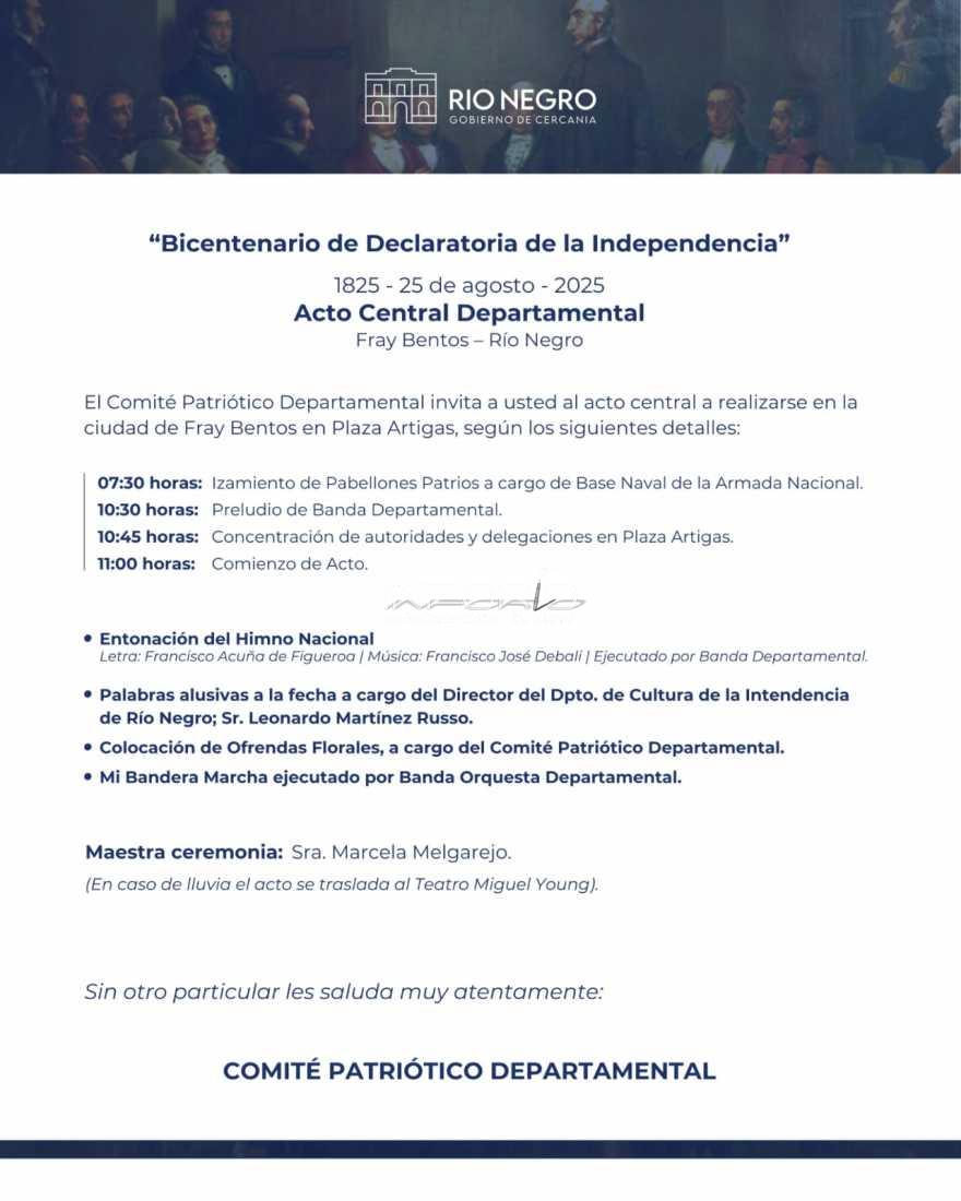 El lunes 25 de agosto, en celebración de los 200 años de la Declaratoria de la Independencia, se realizará el acto central en la plaza Artigas de Fray Bentos.Programa:07:30 - Izamiento de los pabellones patrios a cargo de la Base Naval de la Armada Nacional.10:30 - Presentación de la Banda Orquesta Municip...