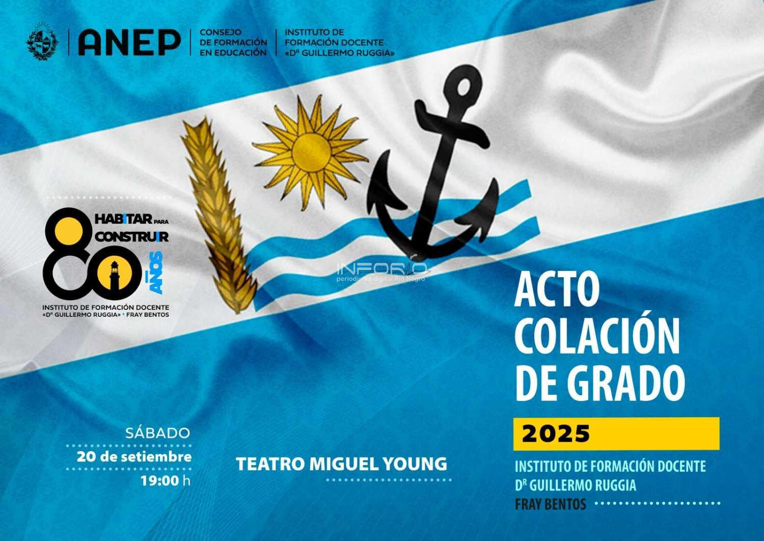 El acto, organizado por el Instituto de Formación Docente, Dr. Guillermo Ruggia, se realizará el sábado 20 de setiembre, a la hora 19.00 en el teatro Miguel Young de Fray Bentos.En la oportunidad, recibirán sus títulos 14 Maestros de Educación Primaria y 14 Profesores de Educación Media....