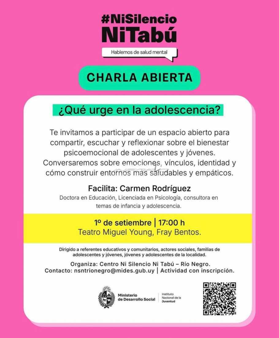 El Centro “Ni Silencio Ni Tabú” de Río Negro invita a participar de la charla: ¿Qué urge en la adolescencia? La actividad contará con la presencia de Carmen Rodríguez, Doctora en Educación, Licenciada en Psicología y consultora en temas de infancia y adolescencia, quien...
