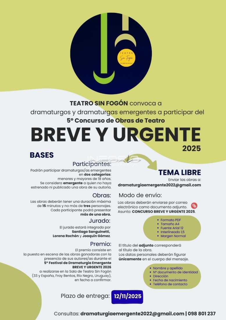El grupo de teatro Sin Fogón convoca a la participación para la 5° edición del Concurso de obras de teatro “Breve y Urgente”.El plazo de entrega de las obras vence el 12 de noviembre de 2025....