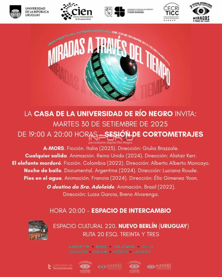La Casa de la Universidad de la República de Río Negro hace una invitación abierta a todo el público para participar de una actividad de cine denominada “Miradas a través del tiempo”.El martes 30 de setiembre será en Nuevo Berlín, en el Espacio 220. En Fray Bentos será el mi...