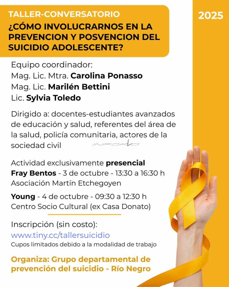 El Grupo Departamental de Prevención del Suicidio invita al taller–conversatorio “¿Cómo involucrarnos en la prevención y posvención del suicidio adolescente?”.La actividad está dirigida a docentes, estudiantes de educación y salud, referentes comunitarios y actores sociales....