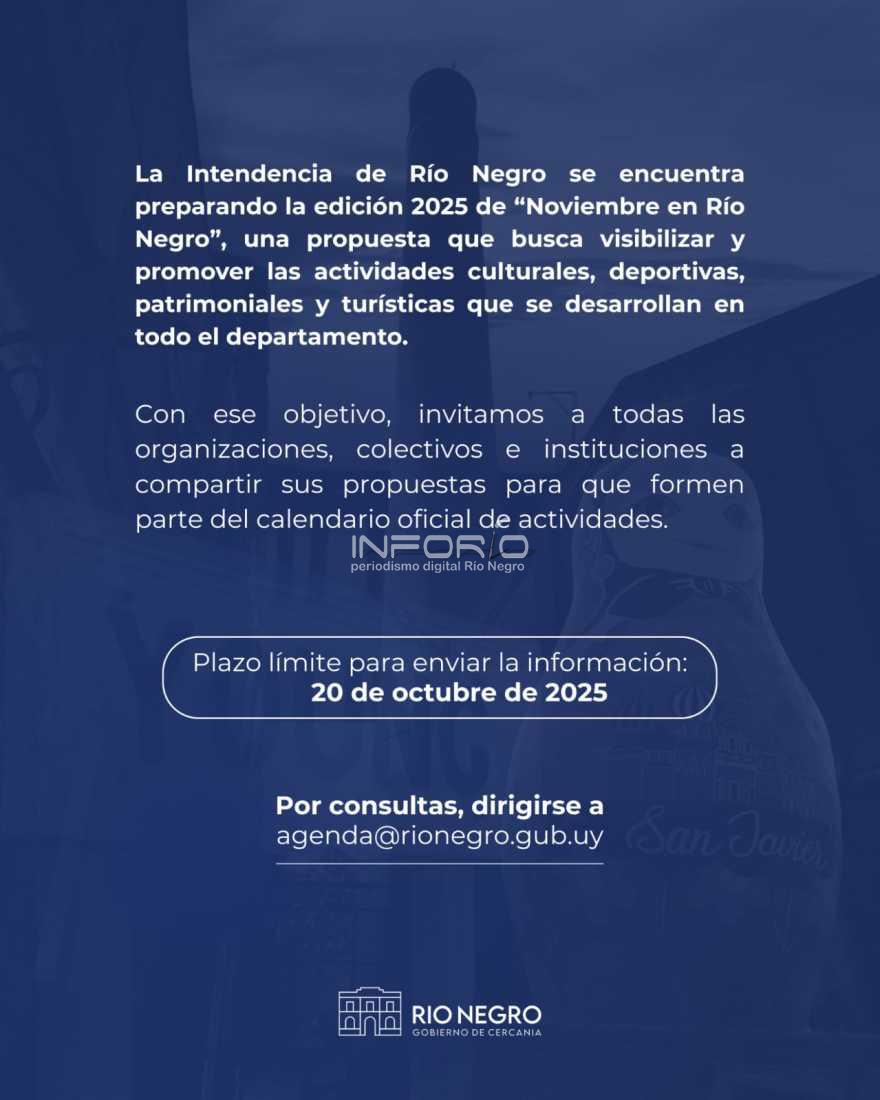 La Intendencia de Río Negro invita a organizaciones, colectivos e instituciones a presentar sus propuestas para formar parte del calendario oficial de la campaña “Noviembre en Río Negro” 2025, iniciativa que busca visibilizar y promover las actividades culturales, deportivas, patrimoniales y turísticas del...