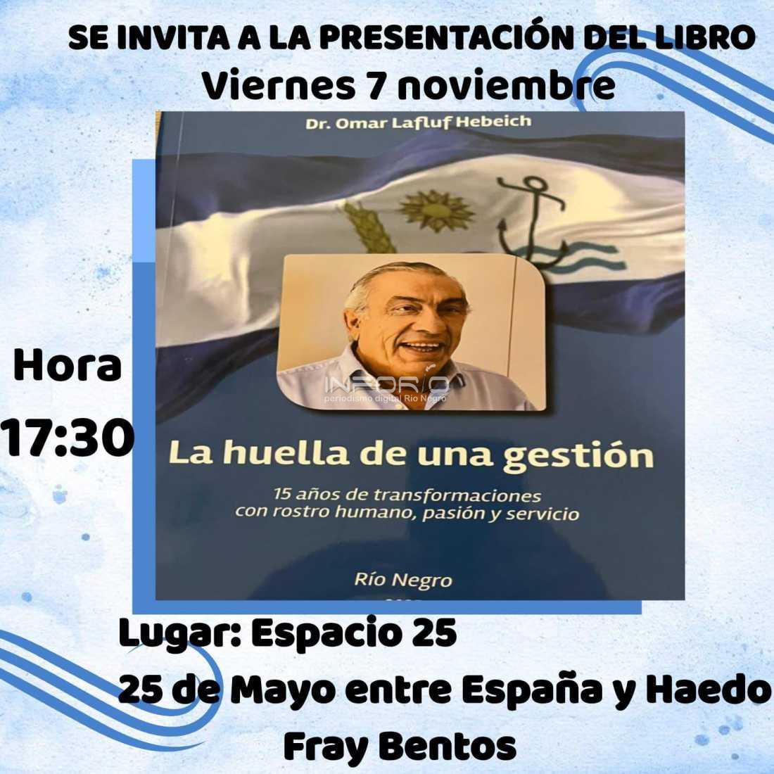 El viernes 7 de noviembre, a la hora 17.30, se realizará la presentación de un libro escrito por el ex Intendente de Río Negro, Omar Lafluf.El libro se titula: “La huella de una gestión. 15 años de transformaciones con rostro humano, pasión y servicio.”El evento se desarrollará...