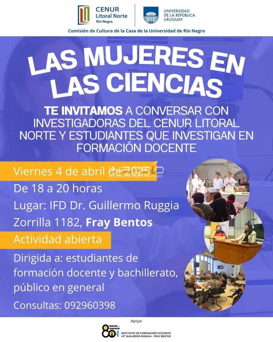 La Comisión de Cultura de la Casa de la Universidad de Río Negro, CENUR Litoral Norte, organiza una actividad denominada “Mujeres en las Ciencias”.El conversatorio será el día viernes 4 de abril de 2025, de 18:00 a 20:00 horas, en el Instituto de Formación Docente “Dr. Guillermo Ruggia&rdq...