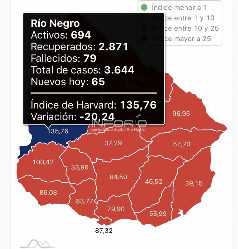 Río Negro está con 123,17, seguido por Artigas con 106,9 y Tacuarembó con 102,9. El resto de los departamentos está con menos de 100 en la escala de Harvard.