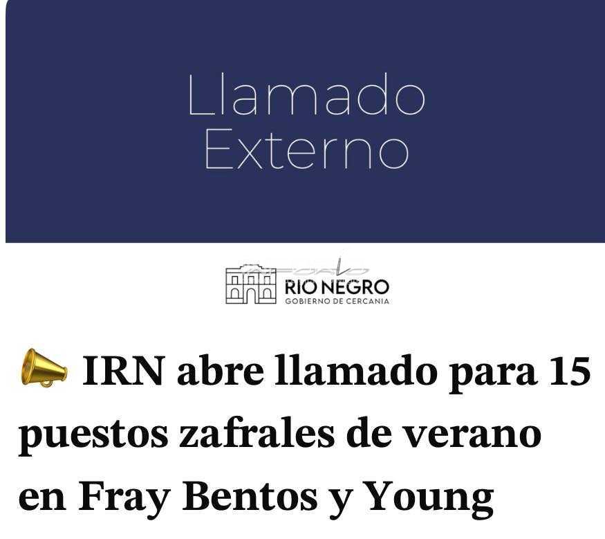 La Intendencia de Río Negro, realiza llamado externo para 15 (quince) puestos zafrales correspondientes a la temporada de verano 2025-2026, destinados a tareas de mantenimiento y limpieza en espacios públicos, en Fray Bentos y Young....
