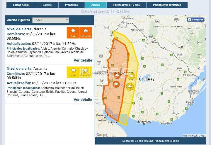El INUMET actualizó la advertencia por tormentas y lluvias la cual ahora abarca a una zona mayor de territorio y todo el departamento de Río Negro y también Soriano están bajo nivel naranja. Fenómeno:Tormentas fuertes y lluvias intensas Probabilidad:> 75% Comienzo: 02/11/2017 a las ...