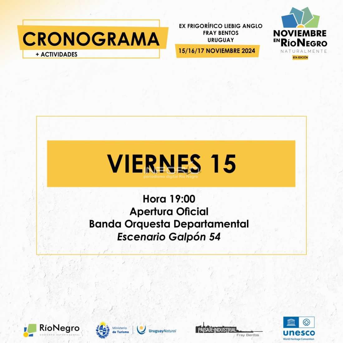 Con variadas actividades, desde hoy viernes 15 y hasta el domingo 17 se realiza el evento “Noviembre en Río Negro”.La cita es en el sitio patrimonial del ex Frigorífico Anglo, en Fray Bentos.La apertura oficial de “Noviembre en Río Negro” es hoy viernes a la hora 19.00, en el Galpón 54 ...