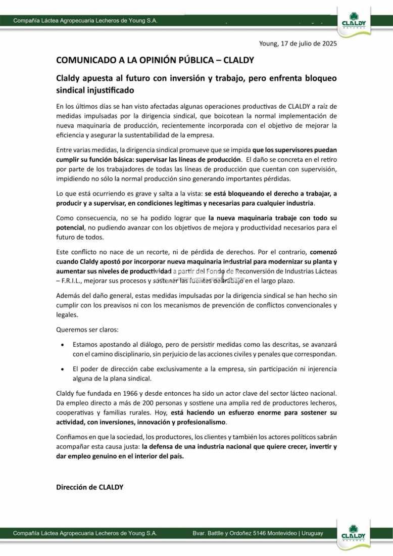 La Dirección de CLALDY emitió un duro comunicado sobre la acción sindical de la industria láctea de Young, la cual provoca importantes pérdidas a la empresa....