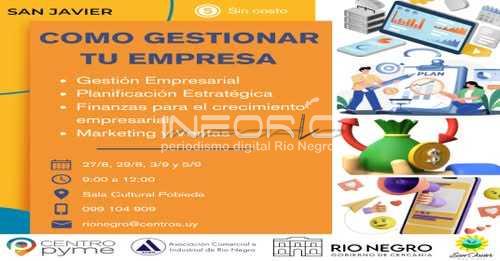 Se viene organizando en la localidad de San Javier, un nuevo taller gratuito de capacitación: Taller: "Como gestionar tu empresa". El mismo se brindará en sala cultural Pobieda y la actividad es totalmente gratuita y organiza el Centro Pyme de Río Negro.Dicho Curso se desarrollará los días 27/8, 29...