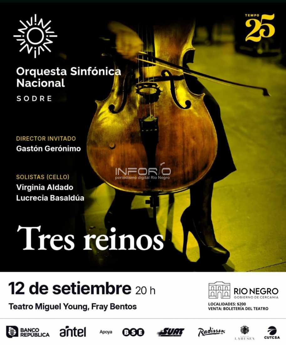 La Orquesta Sinfónica Nacional del Sodre se presentará el viernes 12 de setiembre, a las 20 horas, en el Teatro Miguel Young de Fray Bentos, con el concierto “Tres Reinos”. Participarán como solistas invitadas Virginia Aldado y Lucrecia Basaldúa. Las entradas tienen un costo de $200 y están disponib...