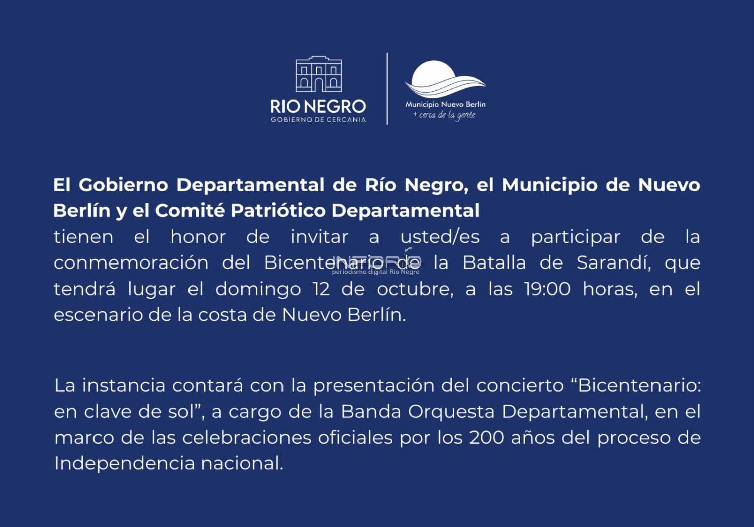 El Gobierno Departamental de Río Negro, el Municipio de Nuevo Berlín y el Comité Patriótico Departamental tienen el honor de invitar a usted/es a participar en la conmemoración del Bicentenario de la Batalla de Sarandí, que se realizará el domingo 12 de octubre, a las 19:00 horas, en el escenario ...