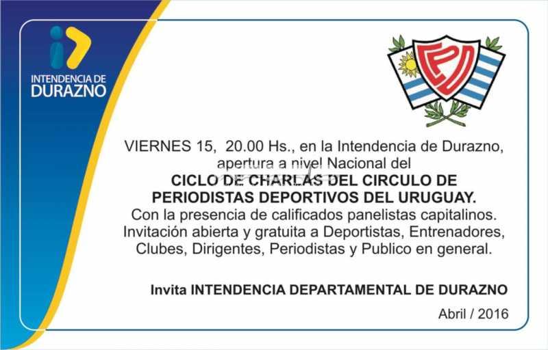 El proximo viernes en la Intendencia Dptal de Durazno, tendrá lugar la 1er charla del Circulo de Periodistas Deportivos del Uruguay a partir de las 20 hs.